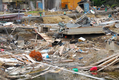 土台のコンクリートまで、あるいは漁港の堤防のコンクリートを壊す水の、津波の力にはいつも驚かされています。 上の写真のように多分コンクリートの土台のようなものを地面からさえ引き剥がす津波の恐ろしさを見せています。